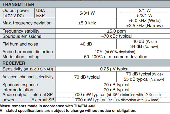 | Desviación de frecuencia máxima | ±5,0 kHz | ±5,0 kHz (ancho) ±2,5 kHz (estrecho) |