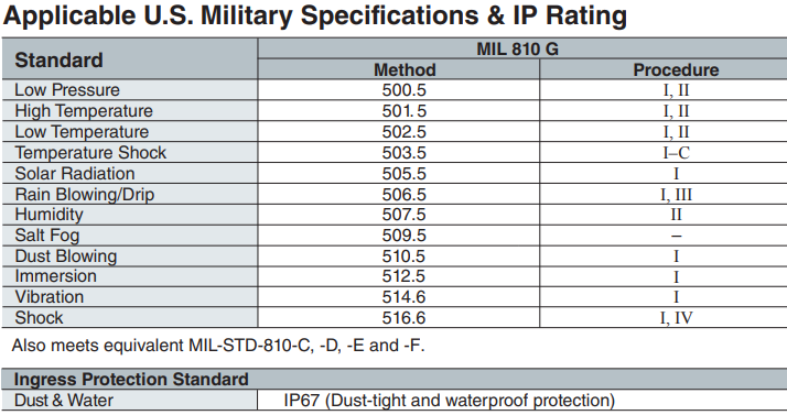 También cumple con los estándares equivalentes MIL-STD-810 -C, -D, -E y -F.