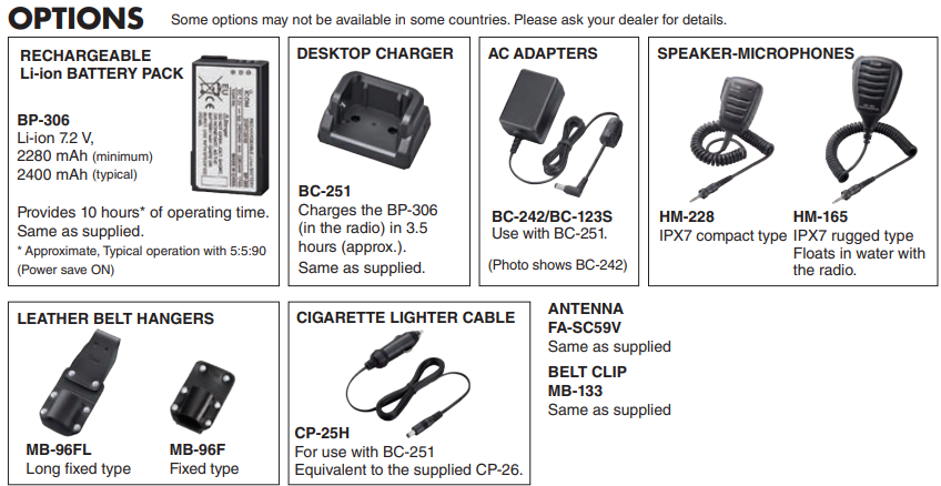 • BP-306 battery pack • BC-251 battery charger • AC adapter* • CP-26 cigarette lighter cable