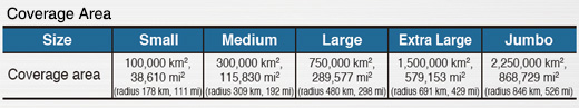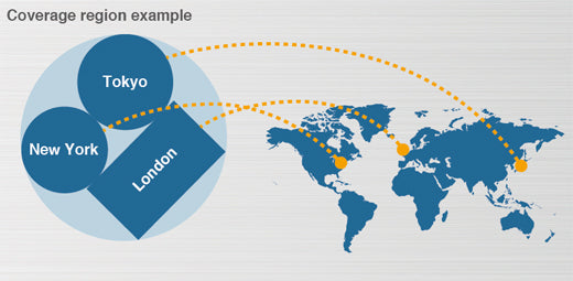 El área de cobertura se puede dividir en diferentes regiones mediante círculos, cuadrados y rectángulos. Por ejemplo, se pueden asignar áreas de cobertura a Tokio, Nueva York y Londres.