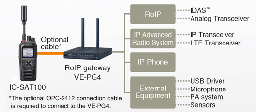Con un gateway RoIP VE-PG4, el IC-SAT100 puede interconectarse con un teléfono IP, transceptores IP, LTE, IDAS digitales* y analógicos.