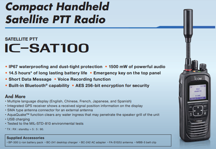 A diferencia de los teléfonos satelitales, los usuarios del IC-SAT100 pueden comenzar a hablar inmediatamente con todas las radios del mismo grupo de conversación, con solo presionar el botón de transmisión (PTT).