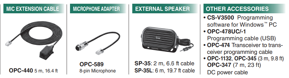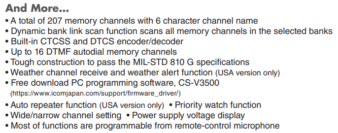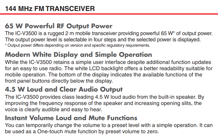 El IC-V3500 contiene potentes comunicaciones con su cuerpo compacto y su sencilla interfaz. El gran disipador térmico de esta radio ayuda a garantizar una salida estable durante las transmisiones continuas. Esta radio es imprescindible para quienes buscan un móvil de largo alcance con un aspecto renovado.