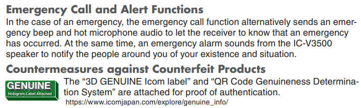 En caso de emergencia, la función de llamada de emergencia envía alternativamente un pitido de emergencia y audio de micrófono caliente para que el receptor sepa que se ha producido una emergencia. Al mismo tiempo, suena una alarma de emergencia por el altavoz del IC-V3500 para notificar su existencia y situación a las personas que le rodean.