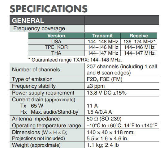 | Cobertura de frecuencias | Versión para EE.UU. | Transmitir | 144-148 MHz | |