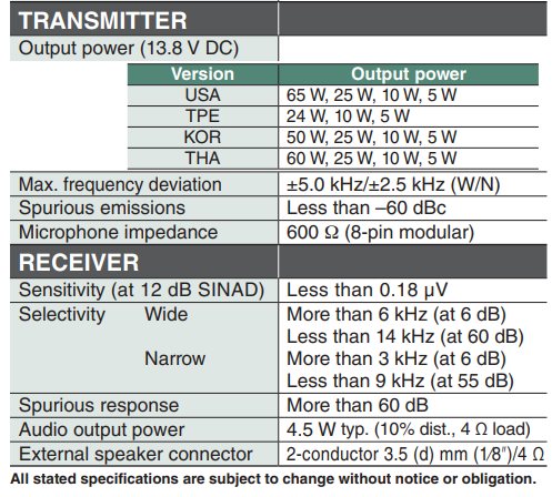 | Versión TPE, Versión KOR | Transmitir/Recibir | 144-146 MHz | ||