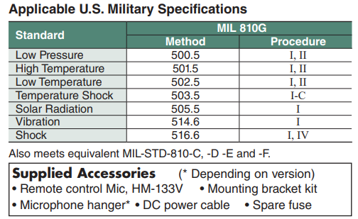 También cumple con el equivalente MIL-STD-810-C, -D -E y -F.