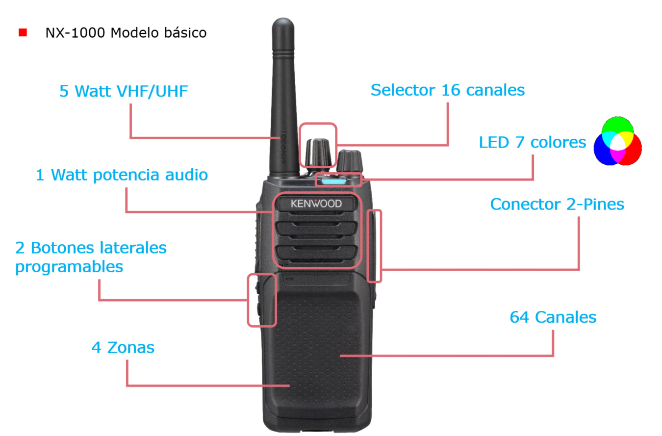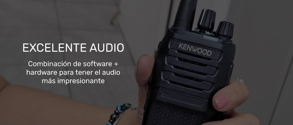 - Excelente calidad de audio KENWOOD; perfil de audio TX / RX con procesador digital optimizable: – Ecualizador de audio; plano, alto, bajo. – Control de autoganancia; encendido, alto, bajo y apagado. – Supresor de ruido. – Configurador del tipo de micrófono externo.