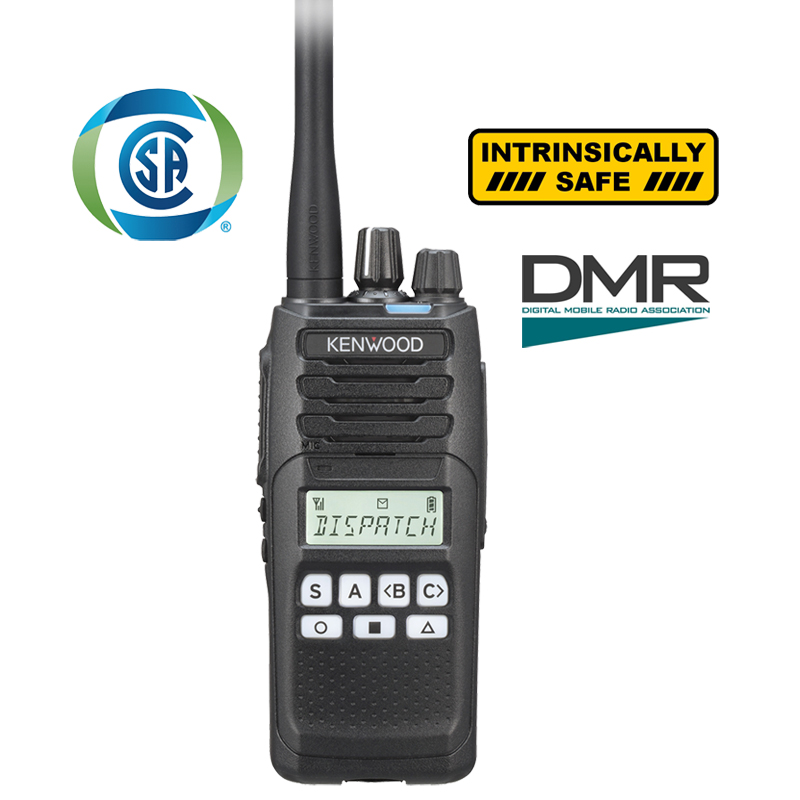 Radio portátil Antiexplosivo digital DMR y analógico. Con pantalla. UHF2 450-520MHz, 5 Watts, 260 canales, roaming, encriptación, incluye antena, batería KNB-82LCM de 1900mAh (Intrinsically Safe), cargador de mesa y clip de cinturón.