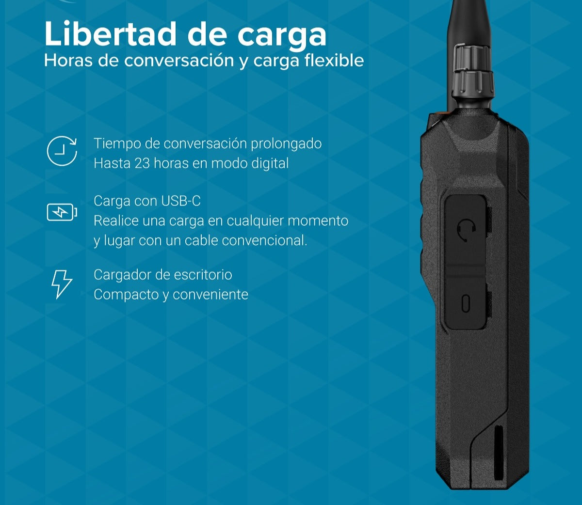 Radio portátil de dos vías diseñado para garantizar un rendimiento excepcional, que combina la simplicidad del Push-to-Talk con la versatilidad de operar tanto en modos analógicos como digitales.