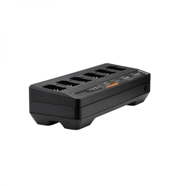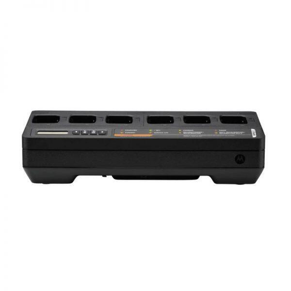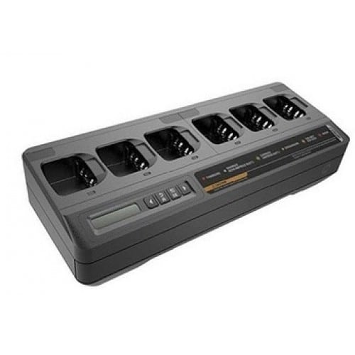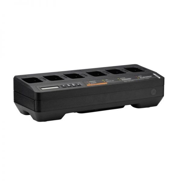 Dispositivo de carga rápida, con seis ranuras, para recargar simultáneamente la batería de hasta seis dispositivos. Cuenta con la tecnología IMPRES de Motorola que permite a este cargador evaluar el estado de las baterías y mejorar su rendimiento. Cada celda dispone de un LED asignado que indica, mediante diferentes colores, el estado de carga de cada batería.