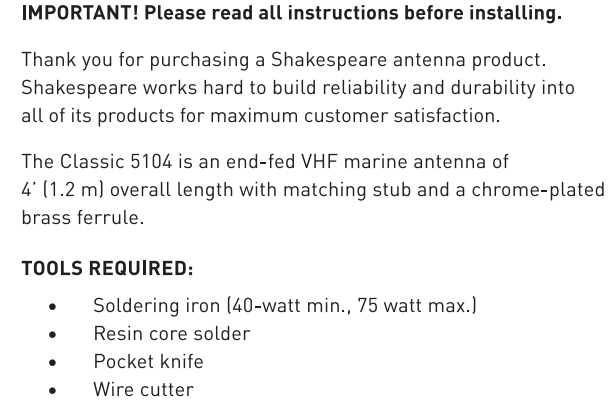 Shakespeare 5104 Classic antena banda marina VHF 132-174 3dB 1,2m sin montaje, incluye conector y cable Precio + iva