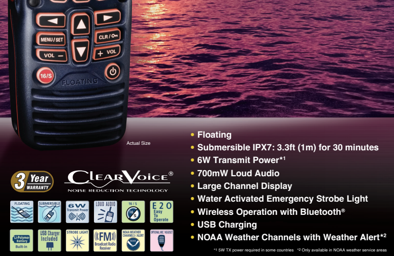 Diseñado para ser resistente y confiable, el HX320 está diseñado para flotar y luchar contra la intrusión de agua con el estándar de impermeabilización IPX7 altamente reconocido.