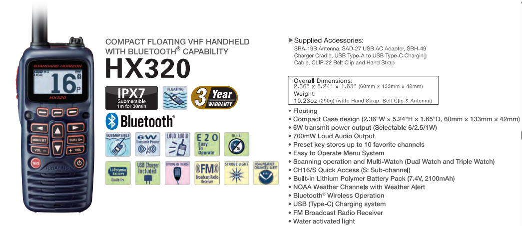 Standard Horizon HX-320 Radio portátil Marina de 6 W con Flotante, Bluetooth, Luz estroboscópica de emergencia activada por agua, Audio Claro, Fácil de Operar, Alerta NOAA Precio + iva