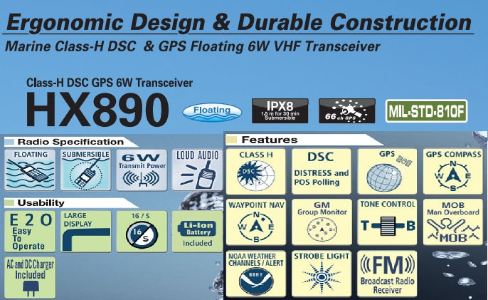 HX890 - Radio VHF/GPS portátil DSC flotante de 6 vatios clase H