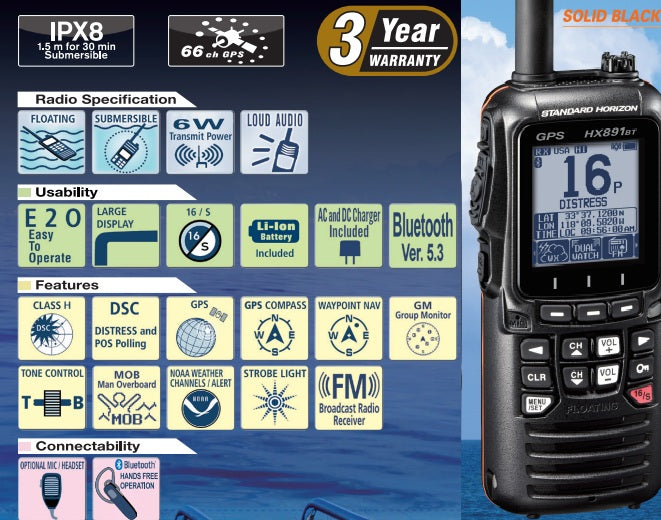 Standard Horizon HX-891BT Solid Black VHF Portátil marino flotante IPX8 DSC Clase H de 6W MIL-STD-810F MOB, Bluetooth, GPS, NOAA, Strobe light Precio + iva