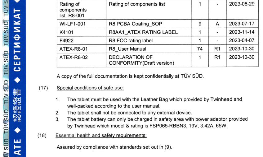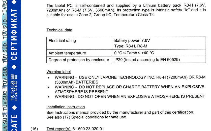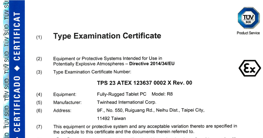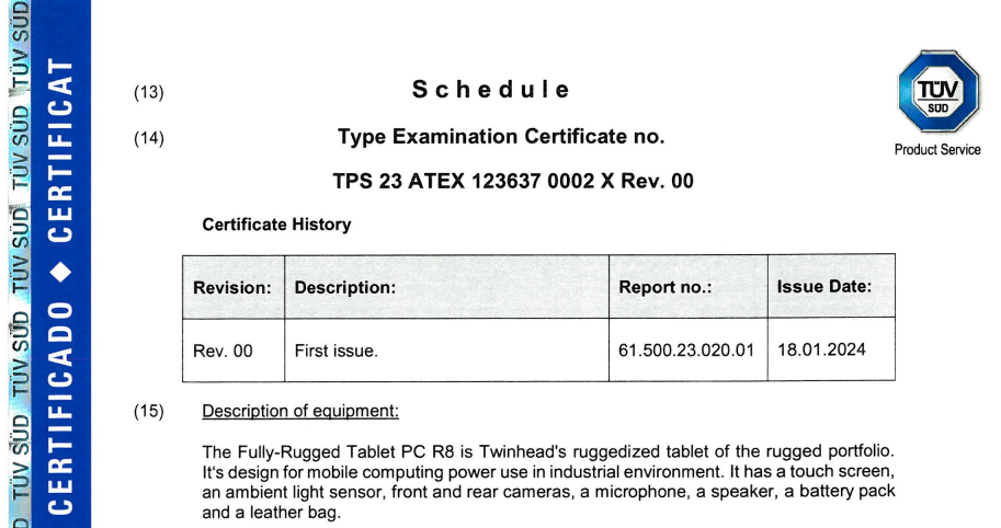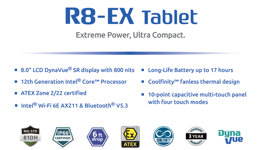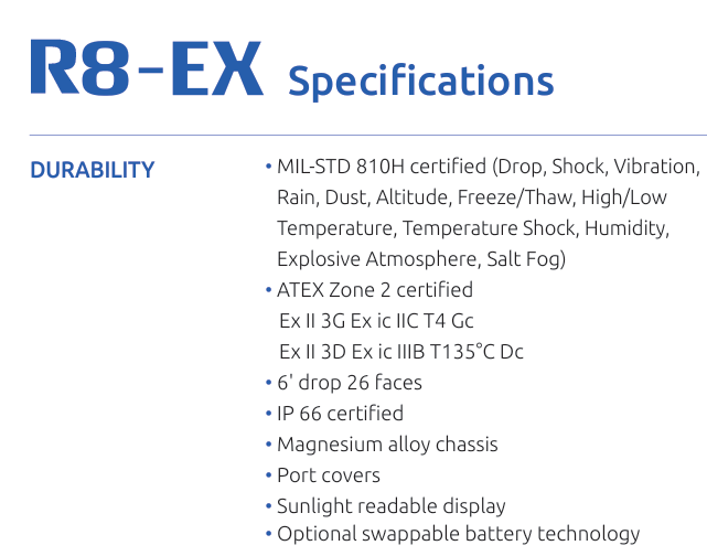 Certificada para su uso en entornos peligrosos, la tableta robusta R8-EX cuenta con la certificación ATEX Zona 2/22, lo que la hace apta para atmósferas potencialmente explosivas. Esta certificación garantiza que los profesionales de primera línea modernos puedan usar el dispositivo de forma segura para brindar soporte remoto, capturar y acceder a información crítica, y realizar diagnósticos precisos en ubicaciones peligrosas.