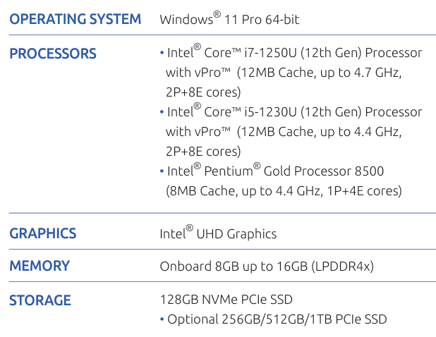 | Procesadores | Procesador Intel® Core™ i7-1250U (12.ª generación) con vPro™ (caché de 12 M, hasta 4,7 GHz, núcleos 2P+8E) Procesador Intel® Core™ i5-1230U (12.ª generación) con vPro™ (caché de 12 M, hasta 4,4 GHz, núcleos 2P+8E) Procesador Intel® Pentium® Gold 8500 (caché de 8 M, hasta 4,4 GHz, núcleos 1P+4E) |