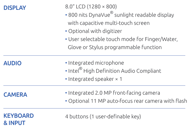 | Mostrar | Pantalla LCD de 8,0” (1280 x 800) de 800 nits DynaVue® legible a la luz del sol con pantalla multitáctil capacitiva Opcional con digitalizador Modo táctil seleccionable por el usuario para función programable de dedo/agua, guante o lápiz óptico |