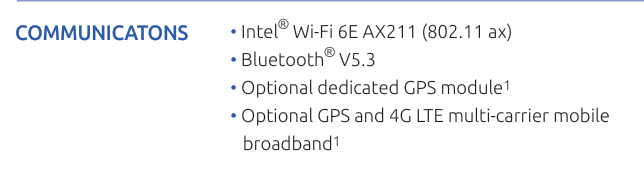 | Inalámbrico y comunicaciones | Intel® Wi-Fi 6E AX211 (802.11 ax) Bluetooth® V5.3 Módulo GPS dedicado opcional 1 GPS opcional y banda ancha móvil multiportadora 4G LTE 1 |