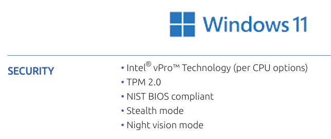 | Seguridad | Tecnología Intel® vPro™ (por opciones de CPU) TPM 2.0 Compatible con BIOS NIST Modo oculto Modo de visión nocturna |