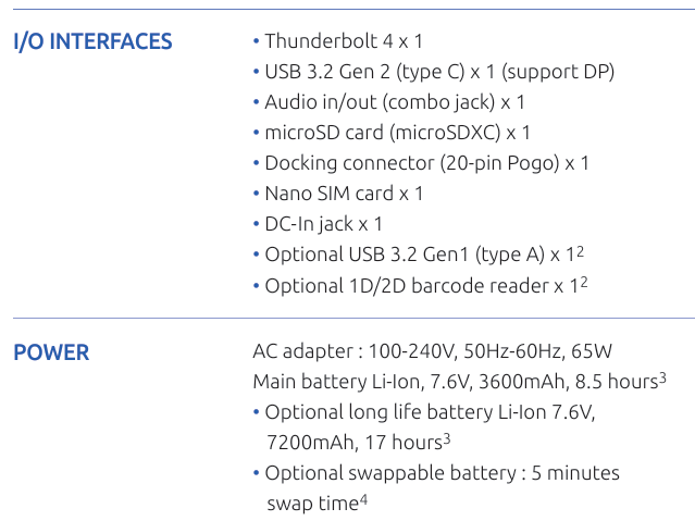 | Puertos de E/S | Thunderbolt 4 x 1 USB 3.2 Gen2 (tipo C) x 1 (compatible con DP) Entrada/salida de audio (conector combinado) x 1 Tarjeta microSD (microSDXC) x 1 Conector de acoplamiento (Pogo de 20 pines) x 1 Tarjeta nano SIM x 1 Conector de entrada de CC x 1 USB 3.2 Gen1 opcional (tipo A) x 1 2 Lector de código de barras 1D/2D opcional x 1 2 |