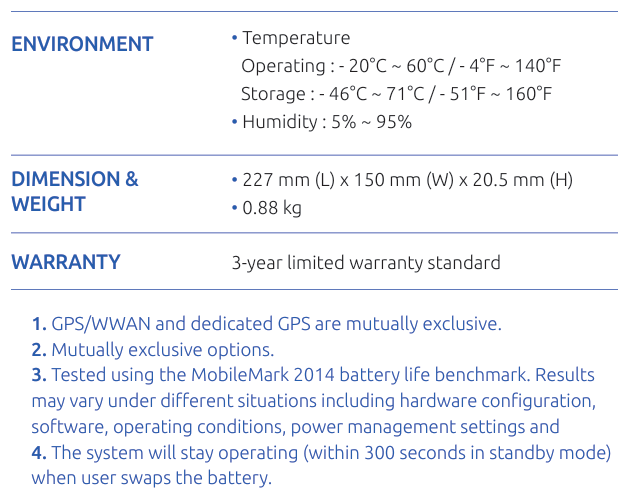 | Fuerza | Adaptador de CA: 100-240 V, 50 Hz-60 Hz, 65 W Batería principal Li-Ion, 7,6 V, 3600 mAh, 8,5 horas 3 Batería opcional de larga duración Li-Ion 7,6 V, 7200 mAh, 17 horas 3 Batería intercambiable opcional: tiempo de intercambio de 5 minutos 4 |