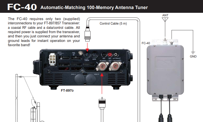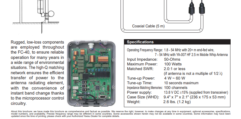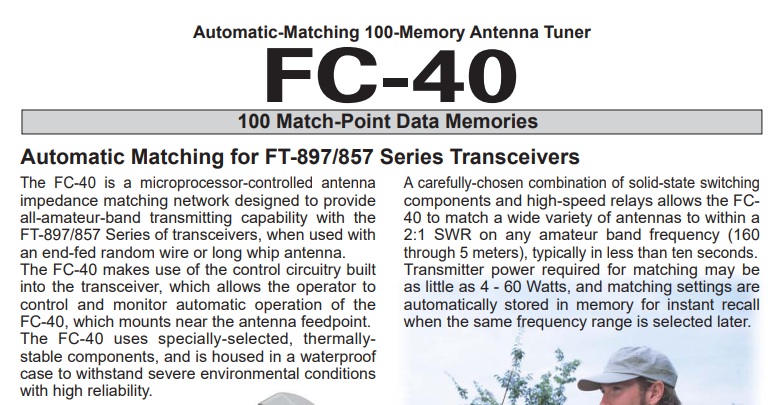 Los ATU FC-40 utilizan circuitos de control internos, lo que permite al operador supervisar y controlar el funcionamiento del FC-40, que se monta cerca del punto de alimentación de la antena. Totalmente impermeable, el FC-40 puede instalarse en exteriores en lugares expuestos y admite una potencia de transmisión de 100 vatios. Los sintonizadores remotos FC-40 están diseñados para operar en frecuencias de 7 a 54 MHz, utilizando un látigo de 2,44 m (8 pies) como el YAESU YA-007, o en frecuencias de 1,8 a 54 MHz (1,8 a 54 MHz) con un cable de longitud variable de más de 20 m (66 pies). El tiempo de adaptación suele ser de cinco segundos o menos, y la potencia de excitación requerida es de 4 a 60 vatios. El FC-40 cuenta con 200 memorias para puntos de ajuste de coincidencia, lo que permite recuperar al instante los ajustes de sintonización.