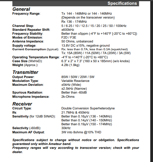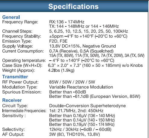 - Transceptor móvil VHF con salida seleccionable de 85W-50W-20W-5W