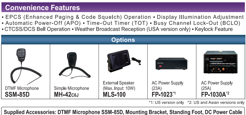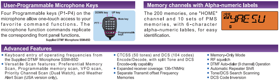 Algunas otras características convenientes del FT-3185R son: gran capacidad de 221 canales de memoria con etiquetas alfanuméricas de 6 caracteres, entrada de frecuencias operativas mediante teclado desde el micrófono DTMF suministrado, funciones de escaneo versátiles como escaneo de memoria preferencial, escaneo VFO, escaneo de canal prioritario (vigilancia dual), codificación/decodificación CTCSS/DCS, memorias de frecuencia de desplazamiento de transmisión separadas, silenciamiento de RF, operación EPCS (enhanced Paging & Code Squelch), ajuste de iluminación de pantalla, apagado automático (APO), temporizador de tiempo de espera (TOT), bloqueo de canal ocupado (BCLO) y 10 canales de transmisión meteorológica NOAA con alerta meteorológica (versión de EE. UU. solamente).