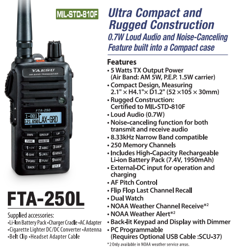 En respuesta a la enorme demanda de un transceptor Airband compacto, Yaesu ha respondido con nuestro transceptor Airband más pequeño hasta el momento: con solo (2,1" de ancho x 4,1" de alto x 1,2" de profundidad), el FTA-250L está garantizado para caber en los lugares más pequeños.