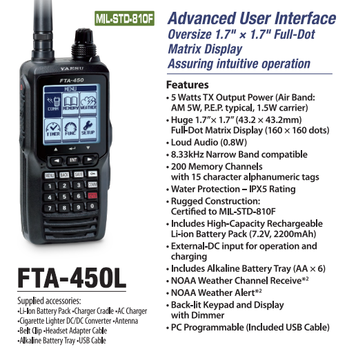 YAESU FTA-450L 200CH Radio para aviación con iconos intuitivos de fácil uso MIL-STD-810F IPX5 USB Precio + iva