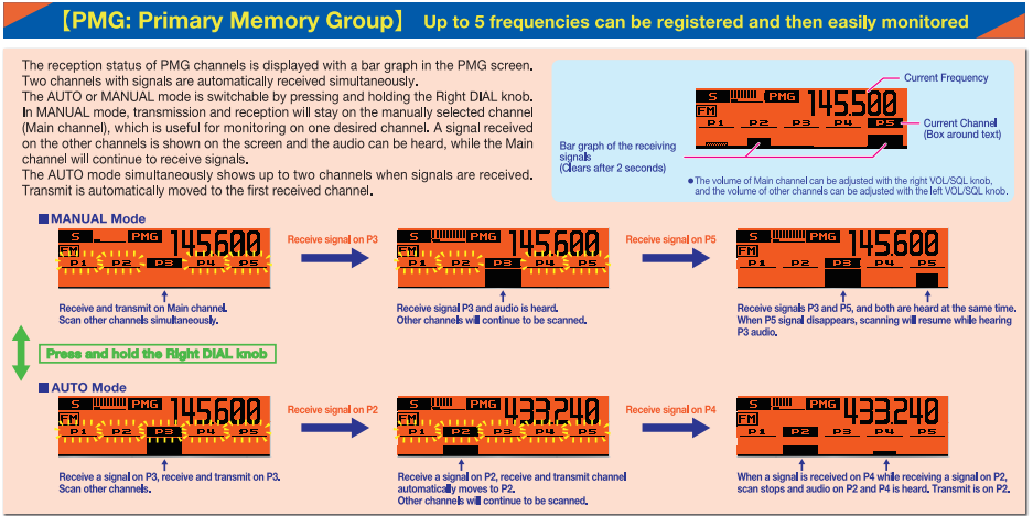 • PMG (Primary Memory Group): Monitorea hasta cinco frecuencias en tiempo real con barras gráficas que indican la actividad de cada canal.