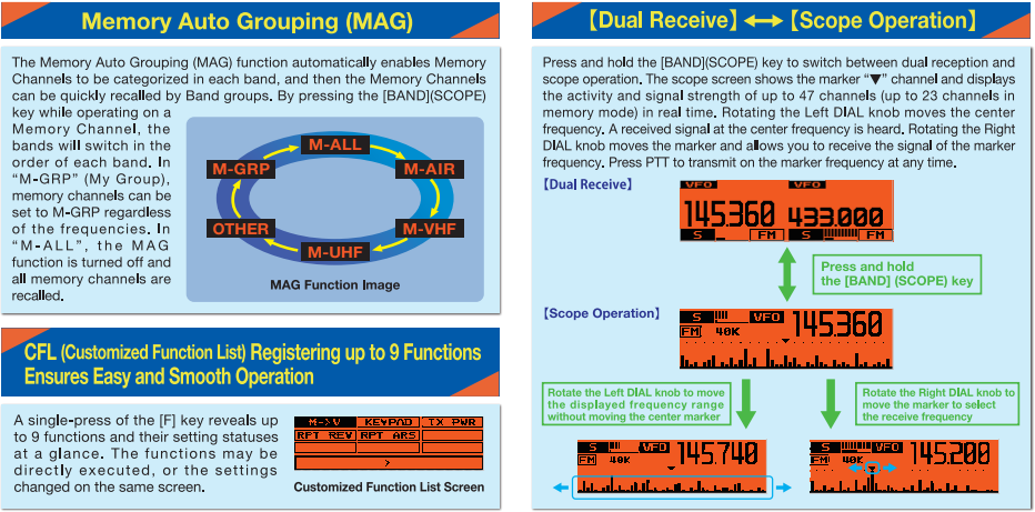 • MAG (Memory Auto Grouping): Agrupa automáticamente los canales por banda, facilitando la navegación entre ellos.