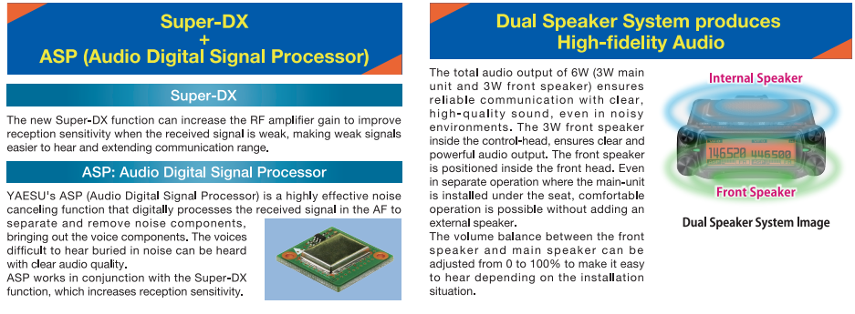 Con la incorporación de Super-DX y el procesador de señales digitales de audio (ASP), el FTM-150R asegura una recepción impecable de señales débiles. Estas tecnologías aumentan el rango de comunicación y optimizan la calidad del audio, proporcionando transmisiones claras incluso en condiciones adversas.