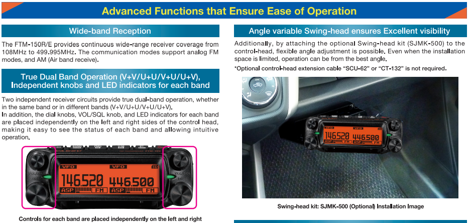 El FTM-150R cuenta con una pantalla de matriz de puntos completa, diseñada para proporcionar una visualización clara del estado operativo de la radio. Su diseño gráfico moderno y su interfaz intuitiva permiten a los usuarios acceder fácilmente a las configuraciones y funciones. Además, el control principal es desmontable, lo que ofrece flexibilidad para configuraciones móviles. Con el accesorio opcional SJMK-500, es posible ajustar el ángulo del control para mayor comodidad durante el uso.