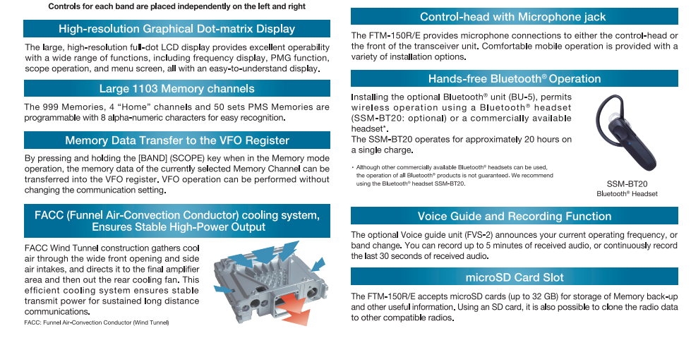 Con la adición del módulo opcional Bluetooth BU-5, el FTM-150R soporta operación manos libres mediante auriculares Bluetooth compatibles como el SSM-BT20. Esta característica aumenta la comodidad y la seguridad, especialmente para usuarios en movimiento. Además, incluye un puerto MicroSD para almacenamiento de datos y conexiones USB para programación y control.