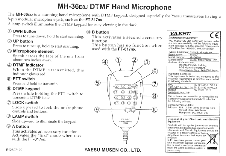 Yaesu MH36E8J DTMF Micrófono parlante remoto compatible FT-991A FT-891