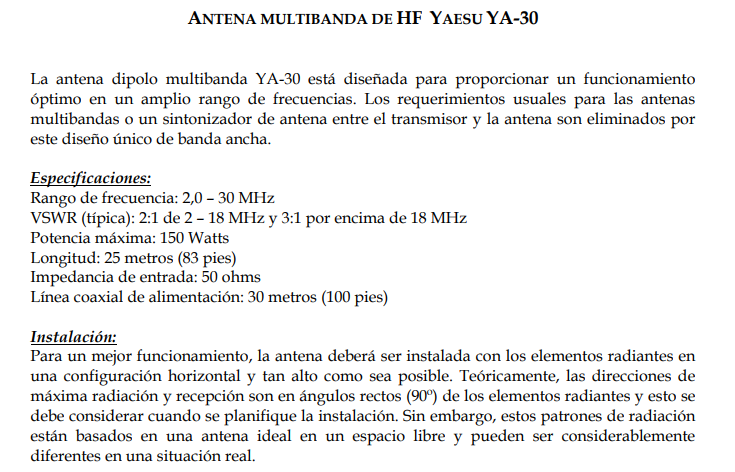 Yaesu YA-30 Antena Dipolo Plegadas HF de Banda Ancha Precio + iva